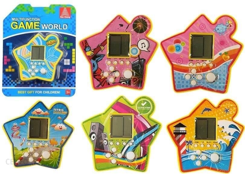 Tetris jest jedną z najbardziej popularnych gier mających za zadanie trenowanie umysłu. Zadaniem jest odwracanie klocków o różnych kształtach w sposób umożliwiający ułożenie ich na planszy tak, by zapełnić cały wiersz. Uzupełniony wiersz znika, pozostawiając miejsce na kolejne elementy — aż do czasu, gdy nie zabraknie go na wyświetlaczu. W czasie gry możne sprawdzić, jaki klocek będzie następny, dzięki czemu użytkownik ma możliwość analitycznego przemyślenia, jaki powinien być jego kolejny ruch. Z każdym usuniętym wierszem wzrasta prędkość gry, a elementy opadają szybciej.Gra elektroniczna w obudowie w kształcie gwiazdy jest bardzo lekka, co w połączeniu z niedużymi wymiarami czyni ją kieszonkowym wariantem, który możesz zabrać ze sobą wszędzie. Składa się z wyświetlacza oraz białych przycisków odpowiadających za funkcje gry. Możemy nimi uruchomić i wyłączyć grę, zatrzymać rozgrywkę, wyłączyć dźwięki lub zresetować planszę, by móc zacząć układać klocki od początku. Pozostałe przyciski służą do nawigacji podczas gry, a także obracania klocków. Kieszonkowa wersja gry elektronicznej umili czas zarówno dziecku, jak i dorosłemu. Rewelacyjnie sprawdzi się w przerwie pomiędzy zajęciami, a także w autobusie lub w domu podczas relaksu.Zabawka jest zgodna z normą EN 71, według zaleceń producenta polecana jest dla wszystkich dzieci powyżej 3. roku życia.Wymiary opakowania 14,5 cm x 11 cm x 2 cmProdukt 7,5 cm x 7 cm x 1,5 cmInformacje o produkcieDługość towaru w centymetrach 13Wysokość towaru w centymetrach 17Szerokość towaru w centymetrach 5Waga gabarytowa w gramach 184.17