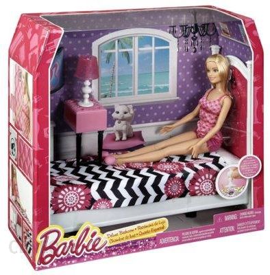 Lalka Barbie z Mebelkami do Sypialni Mattel CFB63 CFB60 Lalka Barbie wraz z zestawem mebelków do sypialni. Piękna Barbie ubrana w różową piżamkę, koszulka jest w białe kropeczki. Na nogach Barbie są różowe pantofelki W Zestaw: łóżko stolik pościel lampkę lalke Barbie Wiek: 3+