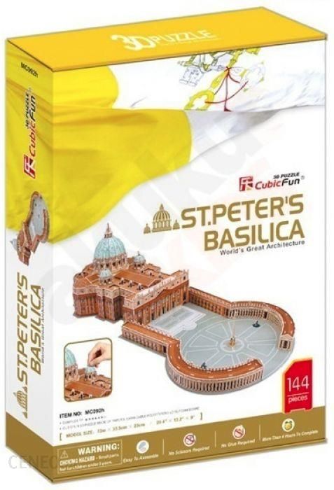 Puzzle 3D Bazylika Św. Piotra to świetna zabawa dla każdego dziecka.Wykonanie elementów z dbałością o każdy szczegół pozwala odtwarzać budynki bez użycia choćby kropli kleju, niepotrzebne są także nożyczki.Puzzle znajdują się w tekturkach, z których należy je wycisnąć i łączyć z innymi odpowiednimi elementami.Z 144 elementów można zbudować budynek z placem o wymiarach 72 x 23 x 33,5 cm.Model ten przedstawia jeden z najsłynniejszych budynków świata – Bazylikę Św. Piotra z Placem Św. Piotra w Watykanie.Zestaw zawiera odpowiednie elementy, które sprawią, że budowla stanie się jeszcze bardziej autentyczna.Zabawka posiada Certyfikat Jakości i Bezpieczeństwa CE.ZAWARTOŚĆ:- 144 puzzleWIEK:od 6 latWYMIARY:wymiary opakowania: 33 x 23 x 6,5 cmgotowego budynku: 72 x 33,5 x 23 cmUWAGI:Ostrzeżenie! Nieodpowiednie dla dzieci poniżej 3 lat. Opakowanie nie jest zabawką Opakowanie należy zachować ponieważ zawiera ważne informacje.