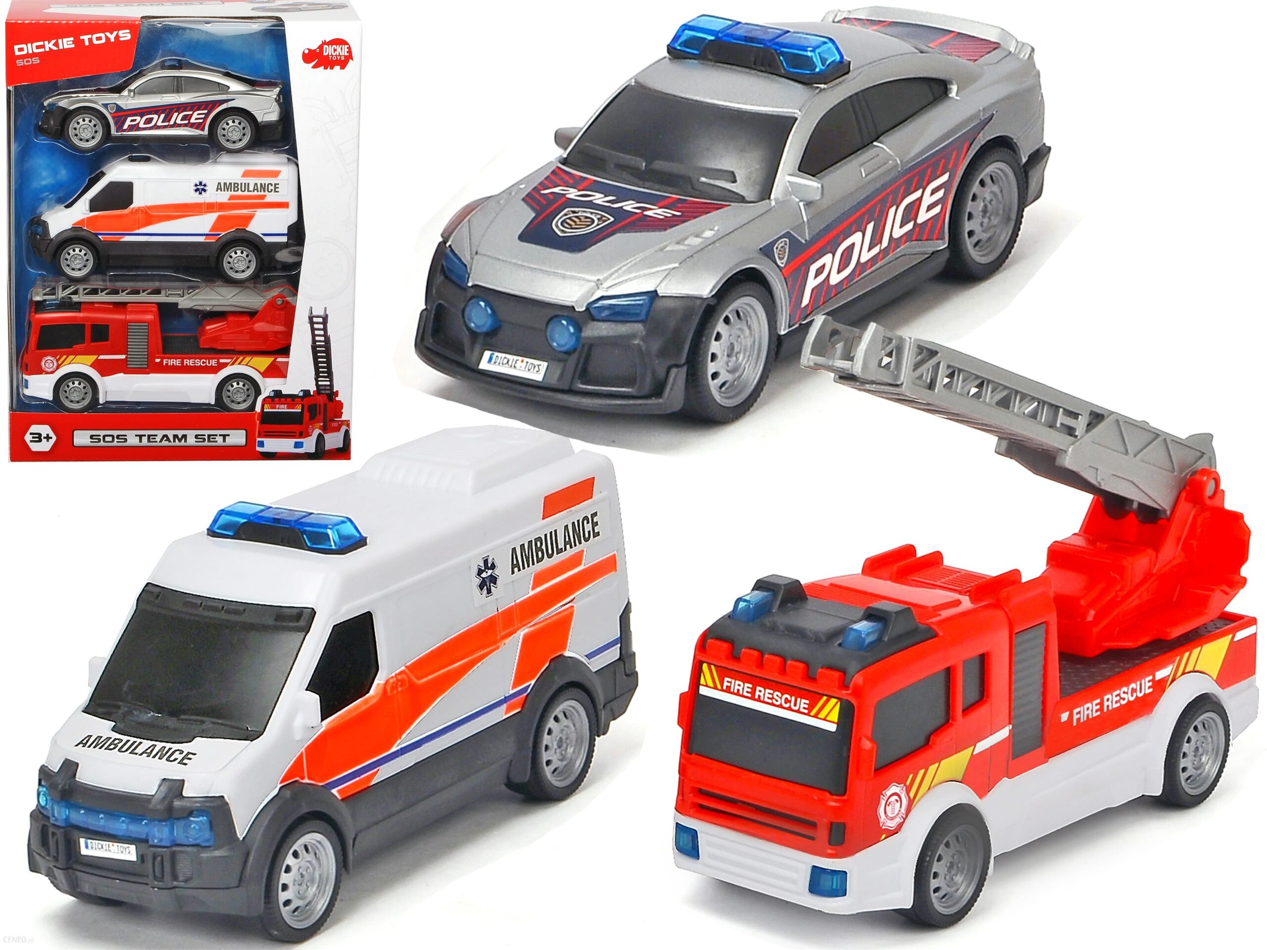Zestaw 3 pojazdów ratunkowych SOS od Dickie Toys: wóz strażacki, radiowóz policyjny i ambulans z lekkością wprowadzają maluchy krok po kroku w tematy zasad ruchu drogowego i docenienia dzielnej postawy przedstawicieli służb specjalnych. Dzieciaki odbywają misje ekscytujących pościgów policyjnych, aż po pożarne interwencje ze strażą pożarną i mogą liczyć na wsparcieCharakterystyka:- pojazdy mają wielkość 14 cm- w zestawie mamy straż pożarną, policję, karetkę- każdy pojazd posada napęd cierny[img-98161-left-thickbox_default][img-98160-left-thickbox_default][img-98162-left-thickbox_default]