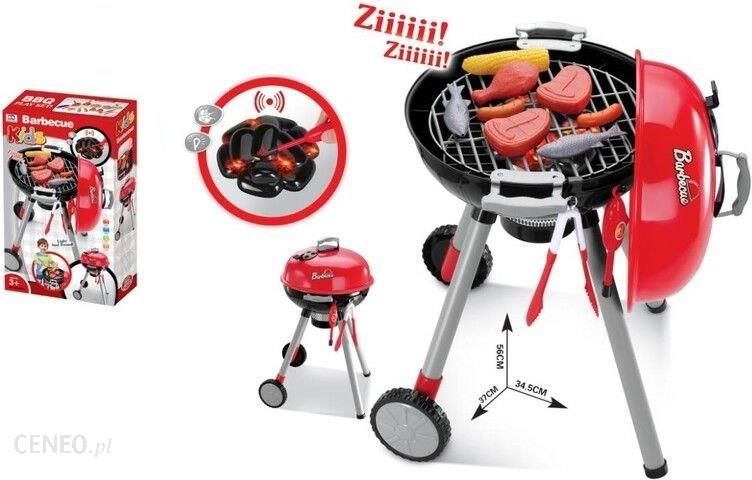 Kulinarne popisy małych kucharzyZabawa w gotowanie i przyrządzanie dań to wciąż jedna z ulubionych zabaw dzieci. Podaruj dziecku ten wspaniały zabawkowy zestaw do grillowania i pozwól rozwijać kulinarną pasję. A nuż wkrótce zaprosi Cię na wyborną kolację?Mądrze inwestując w rozwój swojego dziecka sprawiasz, że uczy się ono przez zabawę. Grill pomoże Ci nauczyć Twoje dziecko obowiązkowości, porządku i dbania o potrzeby (żołądki) domowników.Pora na coś pysznego!Zestaw do grillowania zawiera niemal wszystko, co jest niezbędne do przyrządzenia przepysznych dań.Zestaw ten jest uniwersalny – na pewno spodoba się zarówno dziewczynkom, jak i chłopcom lubiącym eksperymentować przy gotowaniu. Zanim dopuścisz swoją małą pociechę do pomocy w prawdziwym grillowaniu, naucz ją podstaw z zabawkową wersją. Pyszna zabawa gwarantowana!Grill wyposażony został w haczyki na akcesoria do grillowania oraz ruszt do smażenia. Zdejmowana pokrywa pozwala zabezpieczyć „gorący” ruszt po grillowaniu i sprawi, że przygotowane dania szybko nie ostygną.Grill posiada kółka dzięki czemu jest bardzo mobilny. Przeniesienie się z zabawa w inne miejsce nie sprawi dziecku żadnego problemu. Zabawka świetnie nadaje się zarówno do ogrodu jak i do zabawy w domu.Dodatkowe atrakcjeGrill wygląda jak prawdziwy i wydaje dźwięki jak prawdziwy :)Do elementu imitującego węgiel drzewny wkładamy baterie (3 x AAA – brak w zestawie). Zapalarkę przykładamy do węgla i od razu usłyszymy dźwięk grillowanych, skwierczących potraw. Po takim rozpaleniu pojawiają się również światełka imitujące płomienie.Grill jest typu kulistego w kolorze czerwono-czarnym z mnóstwem akcesoriów, które sprawiają, że zabawa jest jeszcze bardziej realistyczna. Dzieci mogą naśladować swoich rodziców podczas urządzania grilla w całkowicie bezpieczny, umożliwiający swobodną zabawę sposób. Cała zabawka zapakowana jest w kolorowe opakowanie.Zestaw zawiera:Grill na kółkach,Ruszt na potrawy, Ruszt na węgiel,Pokrywę z wentylacją, Węgiel z efektami świetlnymi oraz dźwiękowymi, Zapalarkę,Szczypce, Bakłażan i kolbę kukurydzy,2 steki, 2 ryby, 2 udka z kurczaka, 2 kiełbaski, całego kurczaka,2 talerzyki,2 kubeczki z podstawką,Nóż, widelec, łyżkę,Oryginalne opakowanie.Specyfikacja:Wymiary po złożeniu: 56 x 37 x 34,5cmWymiary opakowania: 54 x 32,5 x 12,5cmWęgiel na baterie: 3 x AAA 1,5V (brak w zestawie)Dla dzieci: powyżej 3 roku życia
