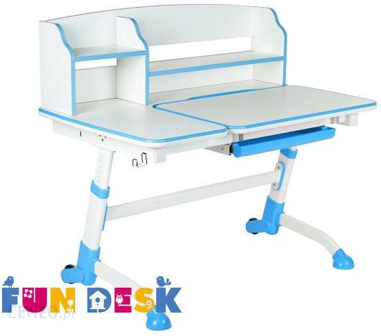 Amare II Blue – Ergonomiczne, regulowane biurko dziecięce z nadstawkąErgonomiczne biurko FunDesk Amare II z rozdzieloną powierzchnią roboczą stworzone z myślą o zapewnieniu bardziej przyjaznych i komfortowych warunków do nauki. Dzięki uchwytowi korbowemu wysokość biurka może być regulowana w sposób ciągły w zależności od wzrostu dziecka. Biurko jest przeznaczone dla dzieci o wzroście od 110 cm. Dla bardziej wygodnej regulacji na nodze biurka umieszczono skalę wzrostu dziecka.Część blatu może być pochylona do 25˚ i wykorzystywana do malowania, pisania lub czytania, podczas gdy inna część pozostaje nieruchoma i może być wykorzystana jako praktyczna powierzchnia magazynowa i przestrzeń robocza. Szuflada z przedziałami znajdująca się pod blatem ma dużo miejsca na książki i przybory piśmiennicze. Biurko posiada nadbudowę, która zapewnia dodatkowe miejsce na książki oraz zeszyty.Stopki z rolkami zaprojektowane z myślą o drewnianych podłogach ułatwiają przemieszczenie biurka. Dodatkową przestrzeń do przechowania rzeczy mogą zapewnić akcesoria do biurka.Materiał: Blat: ekologiczny MDF o klasie E1kolorowe elementy: ABS+PPStelaż stalowy, białyGrubość blatu: 25 mmWymiary biurka:- szerokość: 1190 mm- głębokość: 730×580 mm- wysokość: 810 mmWymiary blatu: 1190×730 mmWymiary pochylanej części blatu:810×490 mmZakres podnoszenia biurka: 580-810 mmZakres pochylenia blatu:0-25°Dodatki:- wieszak na plecak- podparcie łokciaZobacz film pokazujący sposób montaż i regulacji zestawu oraz przedstawiający najpopularniejsze akcesoria.
