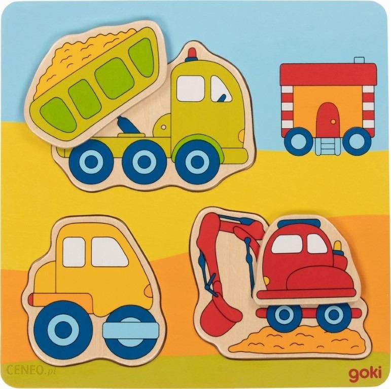 Układanki dla dzieci Goki pomagają maluszkom w kształtowaniu małej motoryki, zapoznaje się z kolorami i kształtami. Drewniane puzzle wielkością są dostosowane do rączek smyków, więc nie sprawiają kłopotu w ich przestawianiu. Układanki ćwiczą u malucha cierpliwość, spostrzegawczość, koncentrację i koordynację ruchowo- wzrokową co przyda się w przyszłości.Dziecko ma za zadanie przyporządkowanie elementu w dane miejsce na planszy mając tylko jego kształt. To z pozoru proste zadanie od Goki przynosi wiele śmiechu, a czas spędzony w trakcie zabawy z rodzicami to niezapomniane chwile dla każdego!Interesująca układanka dla dzieci Na placu budowy marki Goki wykonana z drewna będzie ciekawą zabawą dla dwulatka, któremu przypadłby do gustu upominek w takiej formie. Na podstawie znajdziemy trzy wyjmowane maszyny, gdzie dwie z nich mają dodatkowo wystające elementy, co daje trójwymiarowego efektu i przyciąga wzrok pociechy.Wymiary drewnianej układanki: 21 x 21 x 1,5 cm