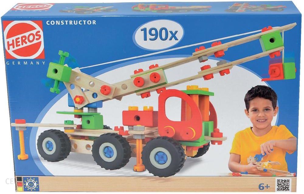 Zestaw drewnianych klocków do samodzielnego skonstruowania pojazdów, zapakowanych w kartowne pudełko.Materiał to drewno bukowe i elementy z tworzyw sztucznych. Zestaw zawiera 190 drewnianych elementów, w tym bloczki konstrukcyjne, śrubki, łączniki, instrukcję i inne, dzięki którym można zbudować 7 modeli: żurawia, samochód buggy, jeep, quad, rower i motocykl trójkołowy, a także stworzyć własny projekt.Heros to firma z ponad 100letnią tradycją, produkująca drewniane zabawki dla dzieci w postaci klocków edukacyjnych dla najmłodszych, zabawek zręcznościowych, samochodzików i kolejek oraz konstrukcyjnych zabawek do samodzielnego montażu dla starszych dzieci. Wszystkie wykonane są z wysokiej jakości drewna pochodzącego z bawarskich lasów, charakteryzuje je bezpieczeństwo i solidność wykonania.Poprzez zabawę dzieci uczą się przestrzennego myślenia oraz ćwiczą umiejętności motoryczne.Nazwa: Konstruktor, zestaw klockówProducent: HerosPrzedział wiekowy: 5-7 lat, 8-11 lat, 12-14 latWiek: 6+Płeć: chłopiec / dziewczynkaIlość elementów: 190Data premiery: 2013-11-05Indeks: 13949976Nr katalogowy: HE-39039