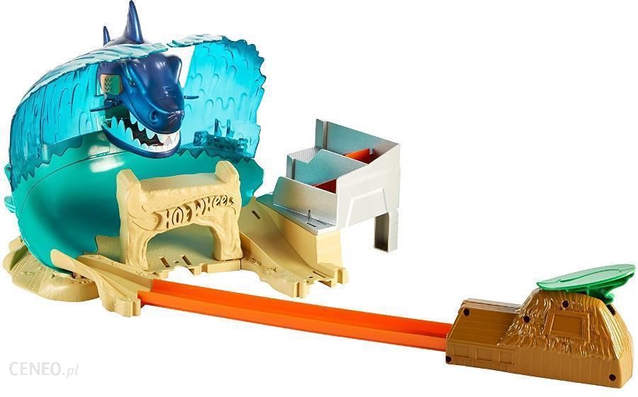 Duży zestaw kaskaderski Hot Wheels z torem, wyrzutnią i złowrogim, pożerającym samochodziki rekinemRozbudź wyobraźnię dziecka podczas zabawy zestawem z samochodzikiem, w którym wielki rekin atakuje Miasto Hot Wheels w czasie zawodów surfingowych Hot Wheels!