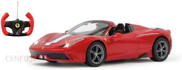 Znakomity licencjonowany samochód zdalnie sterowany Ferrari 458 Speciale A w skali 1/14. Model bazowany na licencji Ferrari odwzorowany został w najmniejszych szczegółach. Auto to bardzo piękny i szybki model. Zarówno karoseria, jak i pozostałe detale pojazdu zostały przeniesione do mniejszej skali.Na drodze, sylwetka maszyny prezentuje się lekko i dynamicznie. Amortyzowane zawieszenie daje płynną jazdę. Frajdę zwiększają świecące przednie i tylne światła ledowe zapalające się w trakcie ruchu.Smaczku dopełnia amortyzowany przód, chromowane elementy oraz lakier wzorowany na oryginalnym kolorze. Wszystko wykonane z materiałów najwyższej jakości. Wszystko to sprawia, że samochód Rastar jest nie tylko źródłem rozrywki, ale także doskonale wygląda na półce.Ferrari 458 Speciale A jest gotowy do jazdy od razu po wyjęciu z pudełka – potrzebujesz jedynie jedną baterię 9V do zasilania kontrolera – którą również możesz kupić w naszym sklepie.Dane techniczneSkala: 1/14Długość: 327 mmSzerokość: 139 mmWysokość: 86 mmPrędkość: ok 8km/hZasięg: do 30mBardzo realistyczne licencjonowane odwzorowanieObudowa wykonana została ze wzmocnionego plastikuSterowanie we wszystkich kierunkachGumowe koła znakomicie imitujące oponyAmortyzowane zawieszenieDźwięk klaksonuAktywne przednie i tylne światła LEDRegulowane ustawienie przednich kółZasilanie modelu: Akumulator 1.2V 400mAhZasilanie pilota: 1 x 9VSkład zestawuSamochód Ferrari 458 Speciale APilot zdalnego sterowaniaAkumulator 1.2V 400mAhŁadowarka sieciowaAntenaInstrukcjaOryginalne eleganckie opakowaniePrezentacja wideo…
