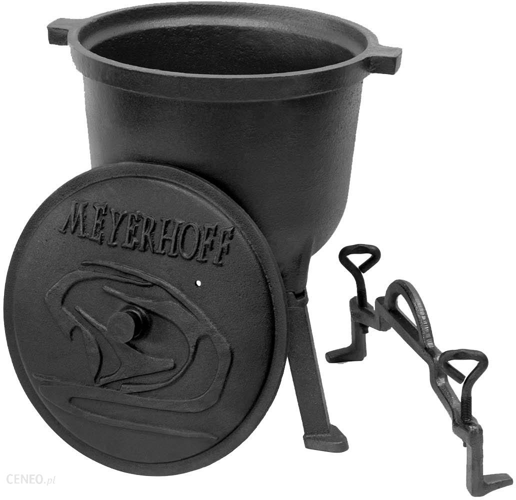 Kociołek żeliwny o pojemności 10 litrów wyprodukowany przez firmę Meyerhoff. Umożliwia przygotowanie sytego i dużego dania jednogarnkowego w każdych warunkach. Kociołek pozwala na przygotowanie jedzenia nad ogniskiem lub paleniskiem np. podczas biwaku w lesie.Wykonany z wysokiej jakości, starannie wykończonego stopu żeliwa odpornego na wysokie temperatury. Konstrukcja całego naczynia wyróżnia się znakomitą odpornością mechaniczną oraz doskonałym utrzymaniem ciepła. Dodatkowym atutem kociołka jest równomierne rozkładanie temperatury, dzięki czemu w krótkim czasie można ugotować gorący i smaczny posiłek.W pokrywie kociołka zastosowano odpowietrznik , który reguluje ciśnienie wewnątrz kociołka, przez co jest on w 100% bezpieczny. Specjalna belka dociskowa umożliwia szczelne zamknięcie naczynia i pozostawienie go na ognisku. Rączka znajdująca się na belce ułatwia wygodny transport podczas przenoszenia kociołka lub w razie potrzeby zawieszenie nad ogniskiem. Nóżki, na których znajduje się garnek, można w razie potrzeby odkręcić, dzięki czemu można go z łatwością umieścić w kominku lub bezpośrednio w palenisku.W zestawie znajduje się:- kociołek 10 l,- pokrywka,- belka dociskowa,- trzy dokręcane nóżki.Dane techniczneMateriał: żeliwoPojemność: 10 lSzerokość całkowita: 35,5 cmŚrednica wnętrza kociołka: 27,5 cmWysokość kociołka z pokrywką: 25 cmWysokość nóżek: 13,5 cmWysokość całkowita: 38,5 cmWaga: 17,5 kgProducent: Meyerhoff