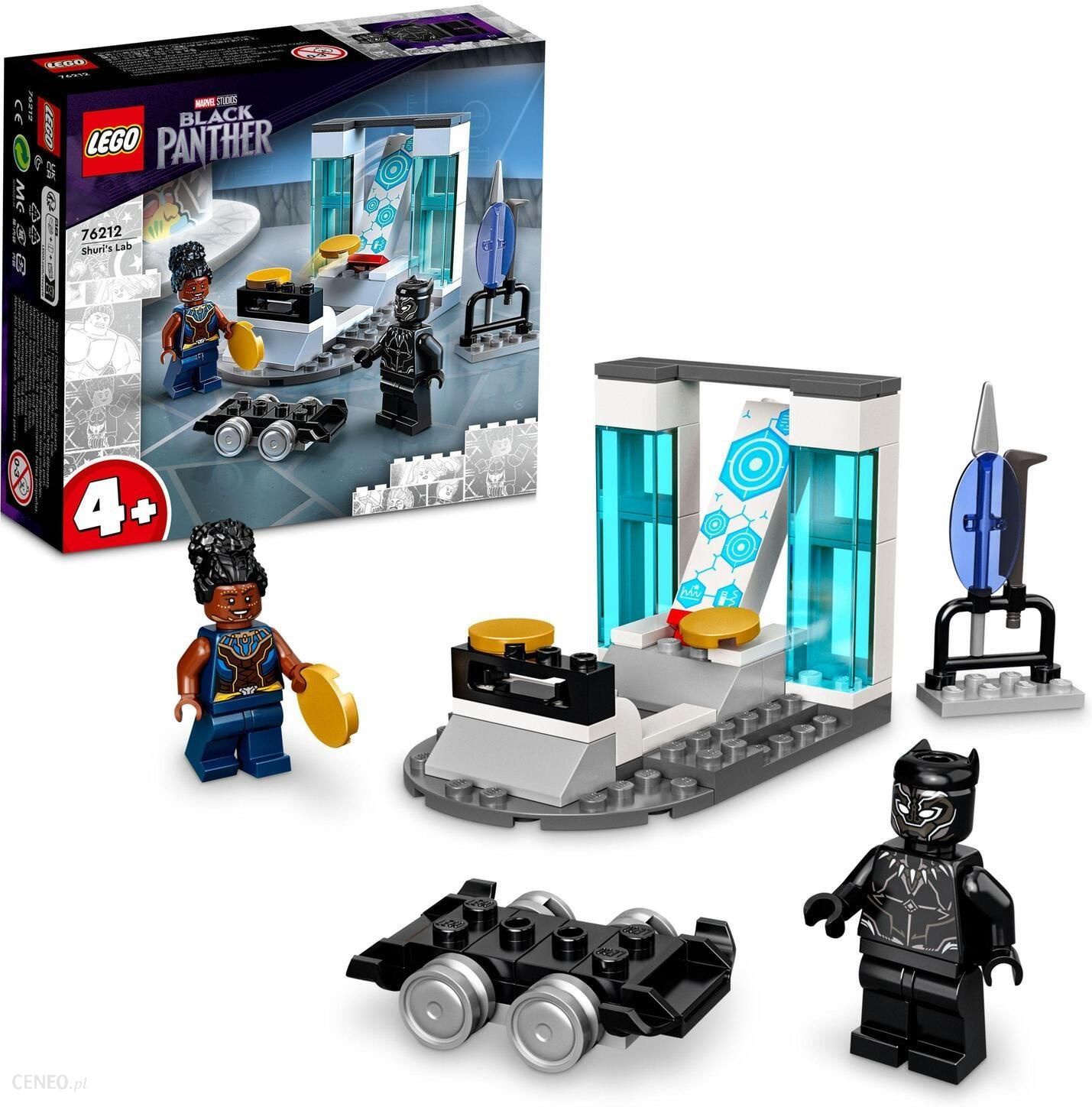 Szczegóły produktu LEGO Marvel 76212 Laboratorium ShuriMłodzi superbohaterowie w wieku od 4 lat przećwiczą umiejętność budowania podczas wesołej i pomysłowej zabawy zestawem LEGO® Marvel Laboratorium Shuri (76212).Najlepszy startW laboratorium Shuri maluchy znajdą mnóstwo ciekawych atrakcji. Shuri testuje rękawice mocy, a Czarna Pantera w tym czasie śmiga na swojej deskolotce. Czy uda mu się nie przewrócić stojaka z bronią? W laboratorium można nawet poćwiczyć strzelanie z wyrzutni dysków. Każda torebka klocków w opakowaniu zawiera cały model i postać, które dzieci mogą szybko zbudować i brać się do zabawy. Do tego duży klocek startowy służy za częściowo zbudowane laboratorium, na którym maluchom będzie łatwiej składać model według intuicyjnych instrukcji zawartych w kolorowym przewodniku z obrazkami.Świetna zabawa dla całej rodzinyZestawy LEGO przeznaczone dla maluchów od 4 lat przypadną do gustu zarówno młodym miłośnikom LEGO, jak i zupełnym nowicjuszom. To również doskonała okazja, by dorośli dołączyli do budowania i zabawy ze swoimi pociechami.