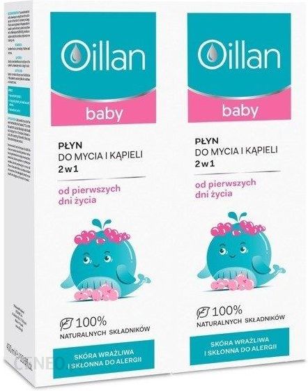 Oillan Baby płyn do mycia i kąpieli 2w1 2x 400 mlSpecjalna niskopieniąca formuła preparatu oparta na łagodnych substancjach myjących pochodzenia naturalnego zapewnia wyjątkowe bezpieczeństwo dla skóry wrażliwej, atopowej i skłonnej do alergii. Preparat delikatnie oczyszcza oraz pielęgnuje skórę. Ma neutralne dla skóry pH i nie narusza jej naturalnej bariery ochronnej. Nie powoduje łzawienia ani podrażnienia spojówek. Zawarty w składzie bisabolol koi skórę, niwelując podrażnienia i zaczerwienienia, a gliceryna intensywnie ją nawilża.