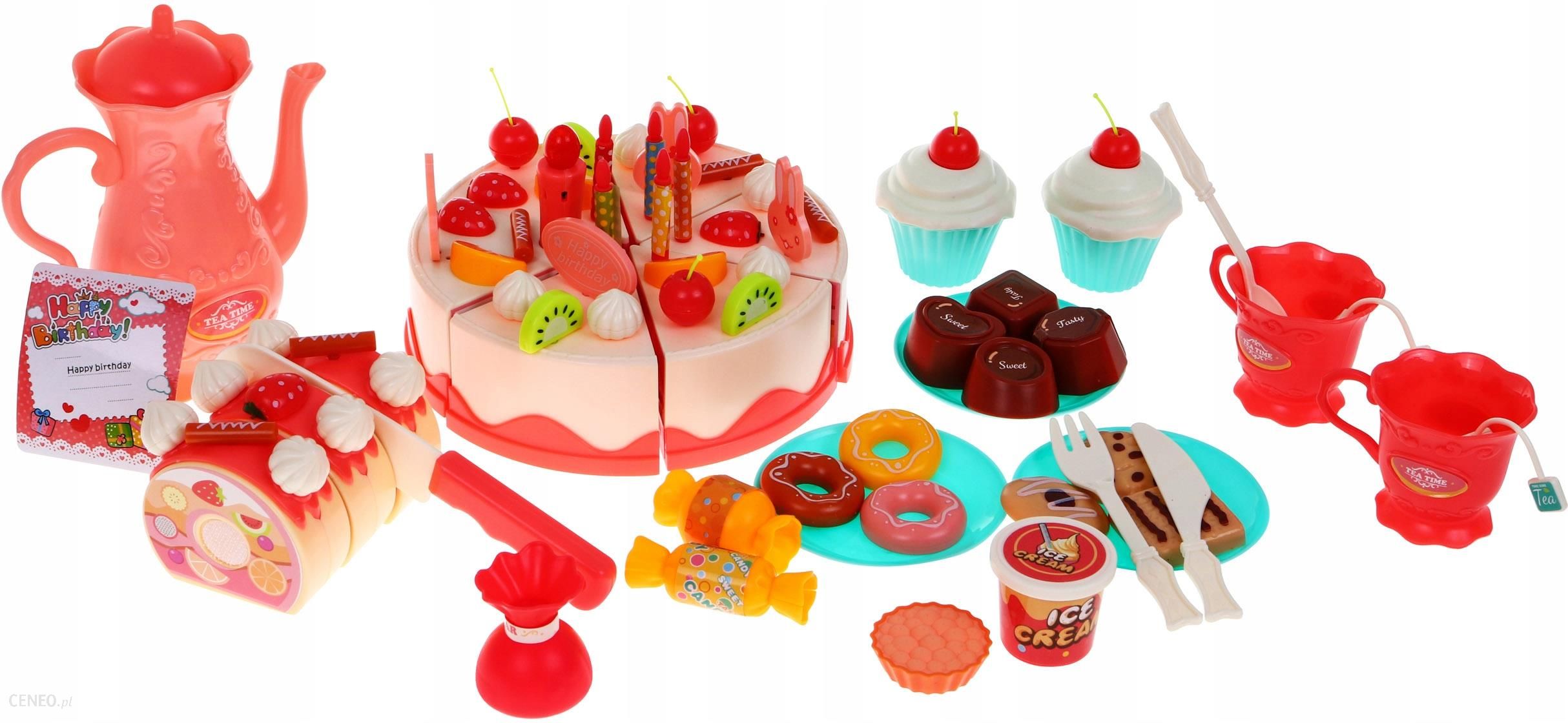 OpisFantastyczne Przyjęcie Urodzinowe TORT 82 Elementów Dźwięki ŚwiatłaPiękny duży zestaw – tort urodzinowy ze świeczkami.Zestaw urodzinowy to idealna propozycja dla dzieci, które lubią bawić się w małego cukiernika.Ten fantastyczny zestaw daje możliwość zrobienia tortu a także rolady.Zabawka pozytywnie wpływa na rozwój kreatywnego myślenia i koncentrację, rozwija wyobraźnię dziecka i zmysł estetyczny.Łącznie w pudełku 82 elementy.Na tort składa się 6 kawałków, łączonych ze sobą rzepami.Tort można „pokroić” załączonym w zestawie nożem.Tort posiada małe otwory umożliwiające jego dekoracje.Duża liczba akcesoriów daje nieograniczone możliwości dla początkujących cukierników.Dziecko może przybierać tort według własnego pomysłu, świeczkami i innymi ozdobami, co wpływa korzystnie na wyobraźnię i zdolności manualne.Zabawka posiada efekty dźwiękowe i świetlne.Duża świeczka wydaje odgłosy braw, należy w nią dmuchnąć, oraz po naciśnięciu słychać melodię happy birthday i świeci się czerwone światełko.Wszystko zapakowane w kolorowe opakowanie, idealnie nadaje się na prezent.Zabawka zasilana bateriami 3 x AG3 – w zestawie.Zabawka przeznaczona jest dla dzieci od lat 3 i posiada certyfikat CEZawartość zestawu- 6 kawałków tortu,- 6 świeczek w tym jedna większa z odgłosami braw (ok. 4,5 cm x 2 cm – świeczka duża, 4,5 x 0.5 cm – świeczka mała),- 6 bez (ok. 2 cm x 2 cm),- 3 wisienki (ok. 3,5 cm x 2 cm),- 3 króliczki (ok.4,5 cm x 2,5 cm),- napis happy birthday (ok. 4 cm x 2,5 cm),- 3 mandarynki (ok. 2,5 cm x 1,5 cm),- 3 kiwi (ok. 2,5 cm x 2,5 cm),- 3 truskawki (ok. 2 cm x 1,5 cm),- 3 pałeczki lukrowe (ok. 2,5 cm x 1 cm),- nożyk duży (14 cm x 2,5 cm),- 2 babeczki (ok. 5 cm x 6 cm),- 13 różnych ciasteczek, cukierków, pomadek (różne kształty i wymiary),- 3 kawałki rolady,- nożyk mniejszy (ok. 10 cm x 1,5 cm),- widelec (ok. 10 cm x 2 cm),- łyżeczka (ok. 10 cm x 2 cm),- 3 talerzyki (średnica ok.8),- 2 kubeczki (ok. 4,5 cm x 6,5 cm),- cukierniczka (ok. 3,5 cm x 4 cm),- lody (ok.3,5 cm x 3 cm),- dzbanek na herbatę z pokrywką (ok. 13 cm x 11,5 cm),- 2 woreczki herbaty do zaparzania (ok. 4,5 cm x 4 cm),- kartka urodzinowa (ok.5 cm x 6,5 cm).Wymiary- tort po złożeniu i dekoracji ok. 16 cm średnica, wysokość ok. 10 cm,- rolada po złożeniu i dekoracji ok. 7 cm x 6 cm.Wymiary opakowania ok. 20 cm x 27 cm x 10 cm.