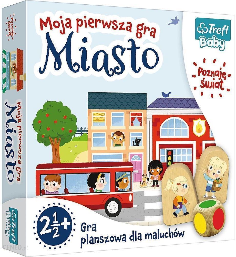 Trefl Moja pierwsza gra Miasto 02110Gra, w której podczas wspólnej zabawy, dzieci mają za zadanie doprowadzić pojazdy na wyznaczone miejsca. Dodatkowo czekają na nie wesołe zadania. Proste zasady, atrakcyjne ilustracje oraz duże drewniane elementy sprawiają, że gra jest idealna do rozpoczęcia przygody z planszówkami. Świetna zabawa, która w przyjaznej formie pokazuje życie w mieście i zaznajamia dziecko z pojazdami, które możemy tu spotkać.