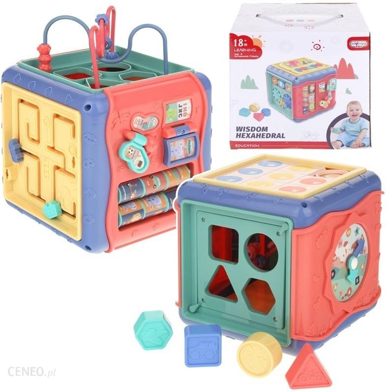 Kolorowa kostka, która dzięki swojej różnorodnej strukturze i bogatej kolorystyce zachęci Twoje dziecko do zabawy, zaś wiele interesujących, interaktywnych elementów, pobudzi zmysły i ruchy precyzyjne dziecka. Zabawka kryje w sobie wiele niespodzianek i jest bardzo przydatna we wczesnym okresie rozwoju dziecka.Zabawka wspomaga rozwój:- zdolności manualnych- koordynacji wzrokowo-ruchowej- kreatywnego działania- logicznego myśleniaKażda ściana kostki ma inną funkcję:1. Sorter klocków z pętlą motoryczną – nauka kształtów i figur.2. Dopasowanka z labiryntem – przesuwanie i dopasowanie.3. Kolorowe obrotowe zębatki – nauka koordynacji ruchów.4. Układanka z cyferkami i obrazkami – nauka cyferek i kolorów. Ułóż cyferki i dopasuj kolory rzędami.5. Zegar- nauka godzin i minut.6. Manualne doświadczenia – książeczka z przekładaną stroną z literkami, motylek z przekładanym skrzydełkiem z obrazkami, 6 walcowatych obrotowych klocuszków ze zwierzątkami i pojazdami.Odpowiedni wiek: 18 miesięcy+Wymiary kostki: 17 (szer.) x 17 (gł.) x 17 (wys.) cmWymiary kostki z przeplatanką: 17 (szer.) x 17 (gł.) x 23 (wys.) cmWymiary klocków: 3,5 (szer.) x 3,5 (gł.) x 2 (wys.) cmWymiary opakowania: 19 (szer.) x 17 (gł.) x 17,5 (wys.) cm