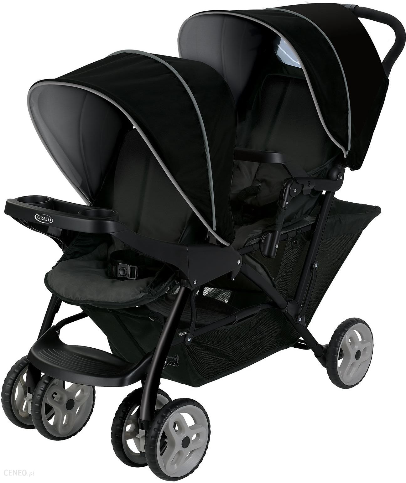 Bliźniacza spacerówka Graco Stadium Duo – kolekcja 2019SIEDZISKO4 pozycje odchylenia tylnego oparcia (od 100 do 150°)2 pozycje odchyleni przedniego oparcia (od 100 do 130°)bezpieczne siedziska z 5 pkt. pasami bezpieczeństwapodwyższone tylne siedzisko i przeźroczyste okienko w budceobydwie budki wykonane z materiałów odpornych na promieniowanie UV zapewniają optymalną ochronę przed słońcemSYSTEM SKŁADANIAwygodny i praktyczny system składania jedna rękąautomatyczny mechanizm blokowania po złożeniu ułatwia przechowywanie i transport wózkaKoła przednie z możliwością blokady do jazdy na wprostWysokiej jakości solidna rama zapewniająca bezpieczeństwo i komfort dziecka.Łatwe manewrowanie w wąskich miejscach i przejściach dzięki optymalnej szerokości.Zalecany wiek Tył 0+ / Przód +6 mies.Produkt nowy, oryginalny, z polskiej dystrybucji.